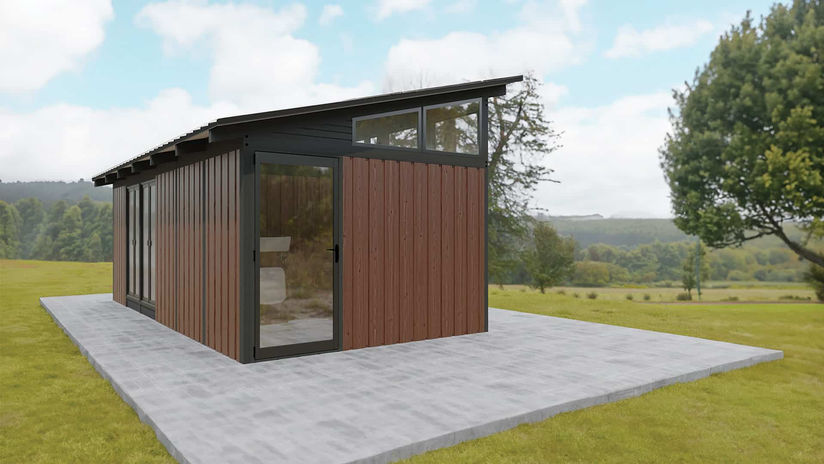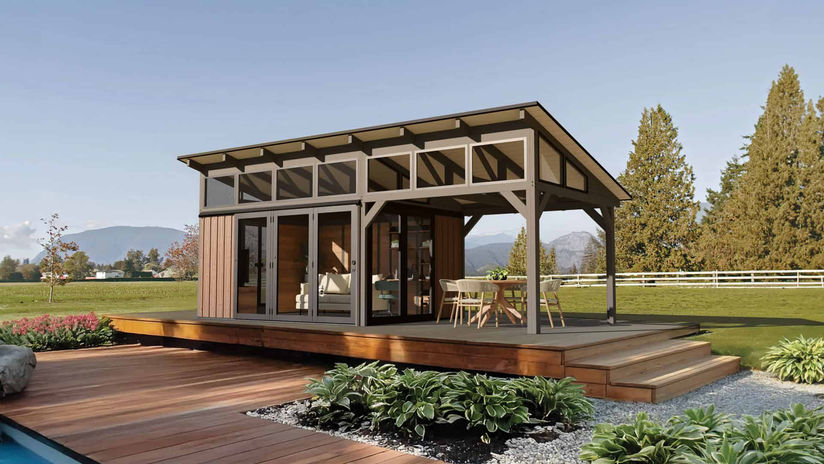 Step into seamless indoor-outdoor living with the Colorado 11×14. Its modern single-slope roof design invites natural light through large windows, complemented by large timber beams.